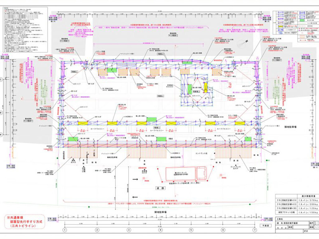 仮設計画図には、現場での安全を考慮し、搬入から設置まで確実な作業を行うべくその精度が大きく求められます。現場での実務経験と豊富な実績を活かし、搬入から設置まで作業の流れも考慮した計画図を製作しています。